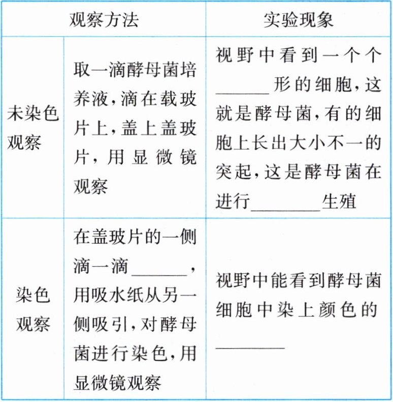 |未染色观察:取一滴酵母菌培养液,滴在载玻片上,盖上盖玻片,用显微镜观察|视野中看到一个个____形的细胞,这就是酵母菌,有的细胞上长出大小不一的突起,这是酵母菌在进行____生殖|