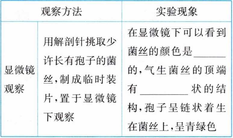 |显微镜观察:用解剖针挑取少许长有孢子的菌丝,制成临时装片,置于显微镜下观察|在显微镜下可以看到菌丝的颜色是____的,气生菌丝的顶端有____状的结构,孢子呈链状着生在菌丝上,呈青绿色|