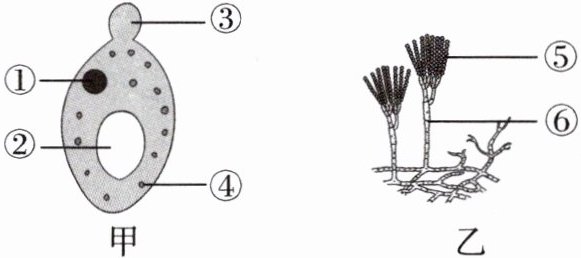 4. 下图是某学生做“观察酵母菌和霉菌”实验时在显微镜下观察到的酵母菌(甲)和青霉(乙)的形态结构图。请根据做过的实验和观察到的实验现象,回答下列问题。