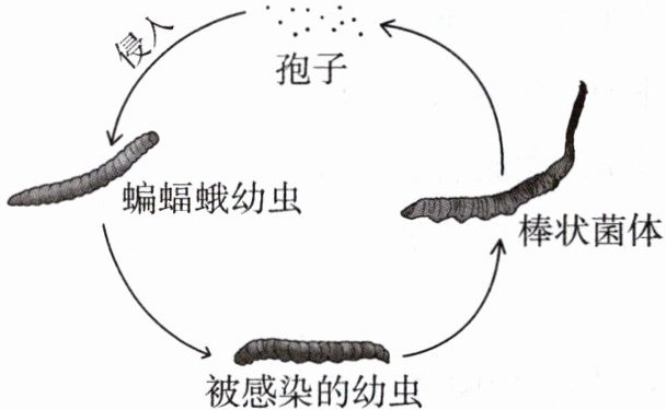 11. (新情境分析)冬虫夏草的形成与某种微生物有关,其孢子侵入蝙蝠蛾幼虫的体内,并长出菌丝吸收营养物质,使幼虫僵化死亡。到了夏天,棒状菌体从虫体头部伸出,继而又释放出孢子,如下图所示。下列有关说法正确的是( )