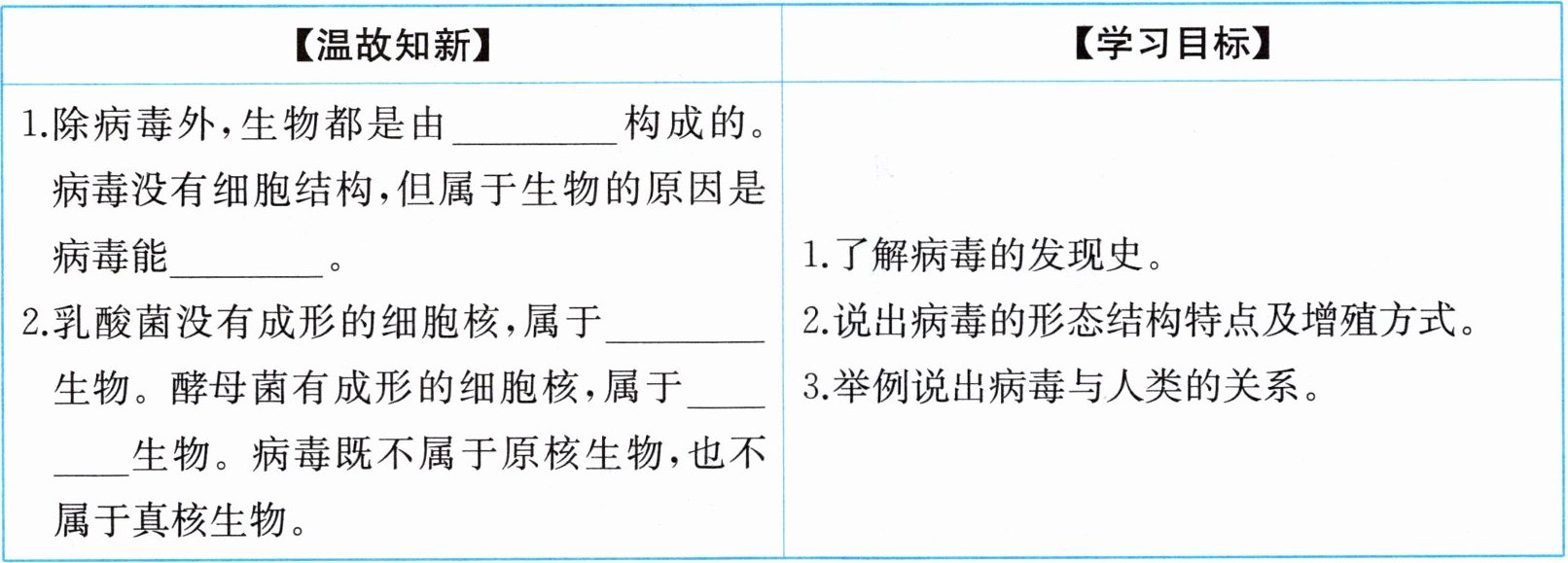 2.乳酸菌没有成形的细胞核,属于______生物。酵母菌有成形的细胞核,属于______生物。病毒既不属于原核生物,也不属于真核生物。|1.了解病毒的发现史。