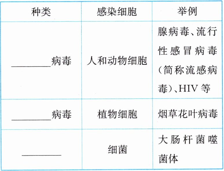 |______病毒|人和动物细胞|腺病毒、流行性感冒病毒(简称流感病毒)、HIV等|