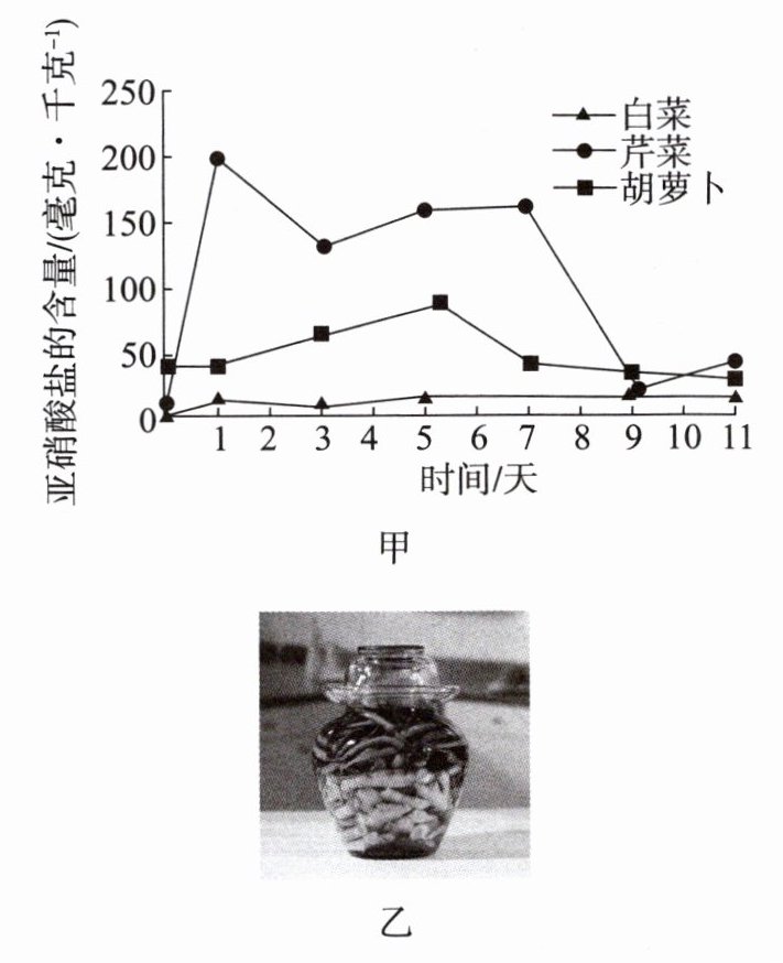 4. 泡菜是我国的一种特色食物,但是传统泡菜的制作过程会产生亚硝酸盐(一种公认的致癌物质),危害人体健康。某生物学兴趣小组的同学尝试制作泡菜,并进行了亚硝酸盐含量的测定(亚硝酸盐的含量与腌制时间、盐浓度、温度等众多因素密切相关),并将亚硝酸盐含量随时间变化的结果绘制成曲线图(如图甲所示)。请回答下列问题。