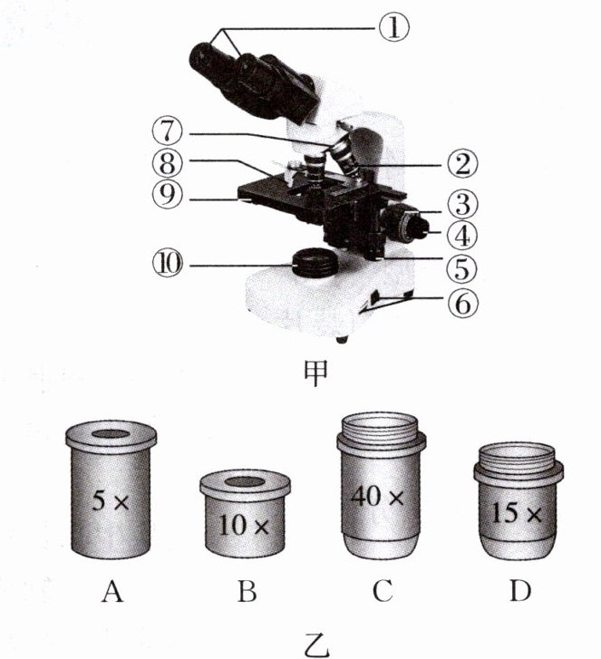 4. 显微镜是生物学实验中常用的仪器,正确使用显微镜能帮助我们更好地认识微观世界。下图甲所示是双目显微镜的基本结构,图乙所示是显微镜的目镜和物镜,请据图回答下列问题。