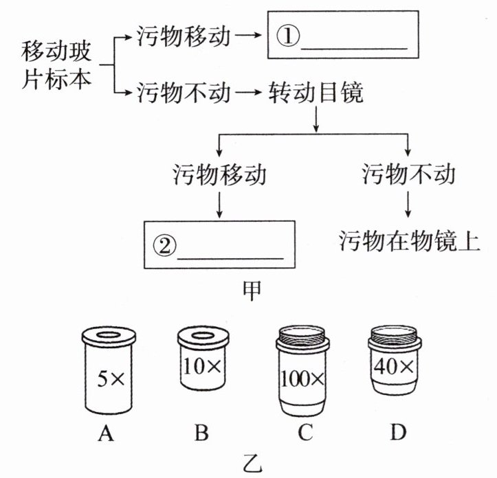 (1)①污物在玻片标本上 ②污物在目镜上