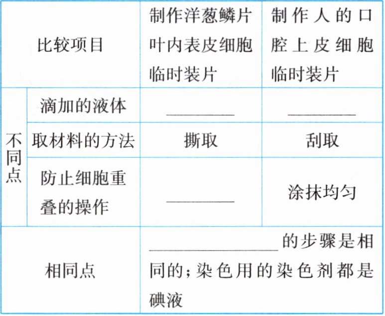 2. [对比归纳]制作洋葱鳞片叶内表皮细胞临时装片和人的口腔上皮细胞临时装片的异同