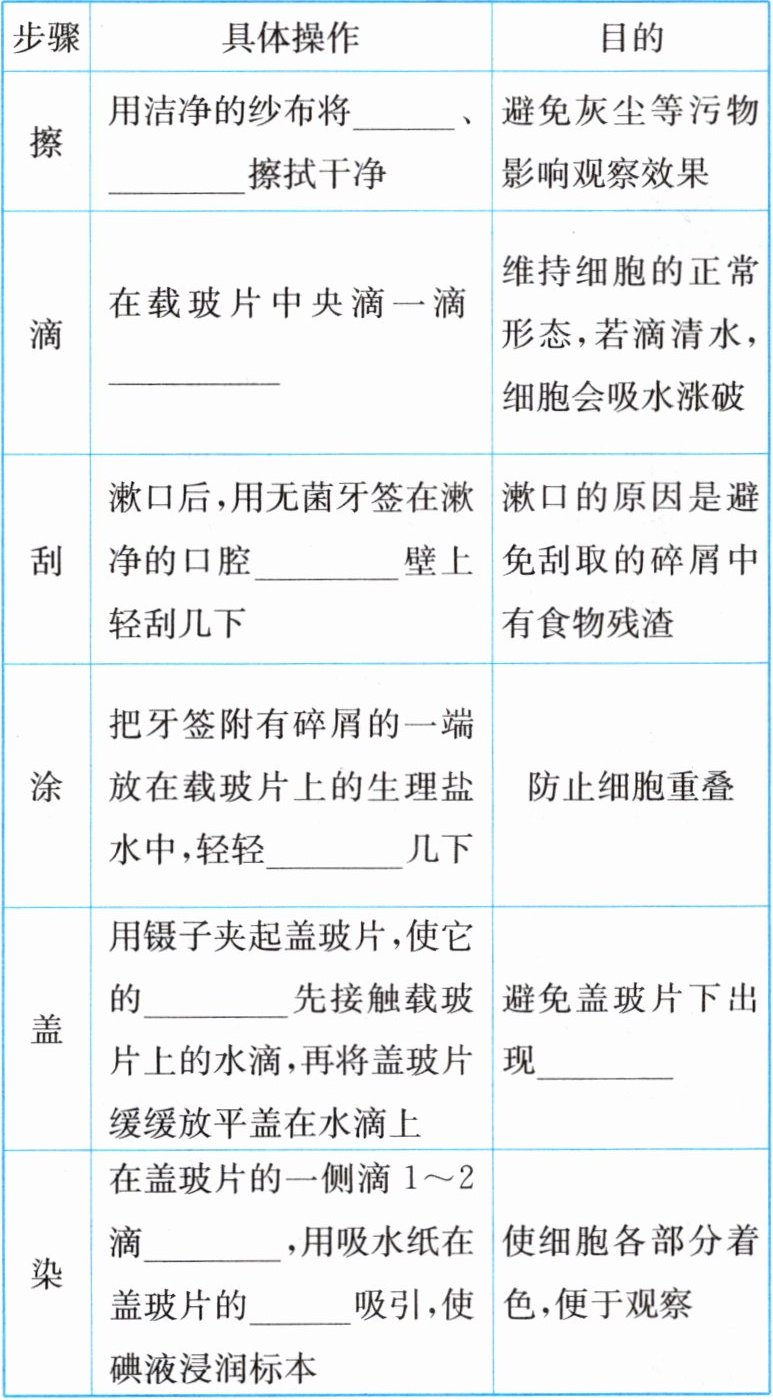 (1)载玻片 盖玻片 生理盐水 内 涂抹 一边 气泡 碘液 另一侧