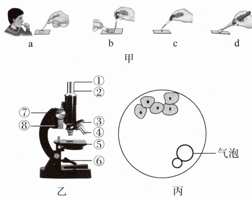 (5) 要在图丙中看到更加清晰的物像,应调节图乙中的[ ]____。染色后,人的口腔上皮细胞中着色最深的结构是____。