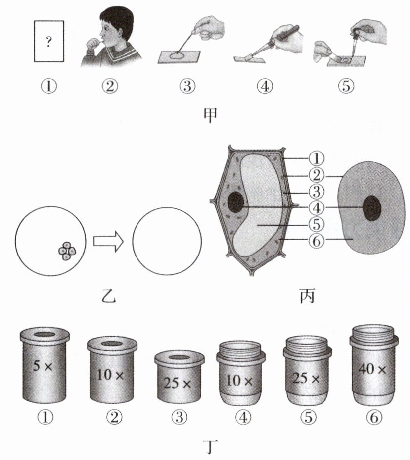 9. 某生物学兴趣小组为了研究生物细胞的结构,进行了相关实验。图甲所示为制作某种细胞的临时装片的步骤,图乙所示为显微镜下看到的视野,图丙为动植物细胞结构模式图,图丁是可供选择的目镜和物镜。请据图回答下列问题。