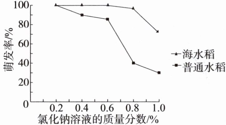 成了一个小实验。科研人员带领小明准备了若干个培养盒,每个培养盒内放置30粒饱满的水稻种子,分别加入等量的不同质量分数的氯化钠(食盐的主要成分)溶液,在适宜条件下进行实验,得到如下数据。请回答下列问题。(1)据图可知,在一定范围内,随着氯化钠溶液质量分数的增加,两组水稻种子的萌发率均会______,但______水稻的萌发率下降更快。该实验中当氯化钠溶液的质量分数为______%时,海水稻与普通水稻种子的萌发率差距最为显著。
