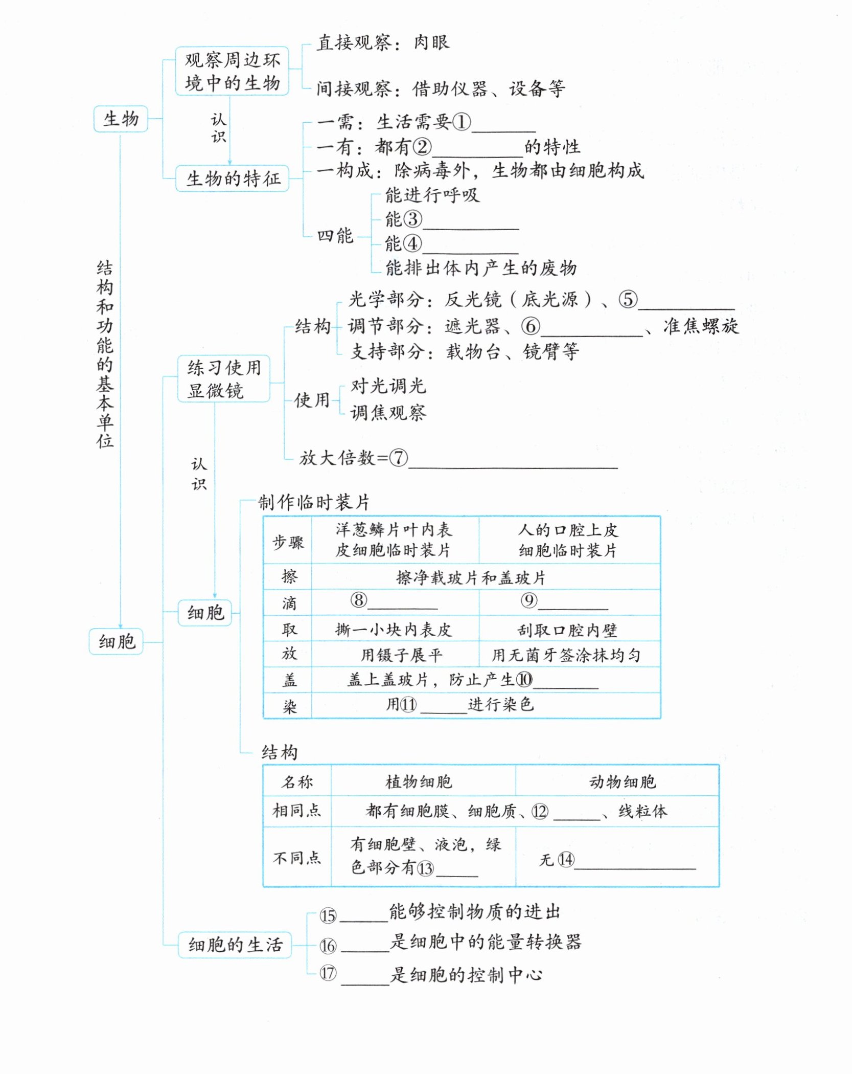 ①营养 ②遗传和变异 ③对外界刺激作出反应 ④生长、发育和繁殖 ⑤目镜和物镜 ⑥转换器 ⑦目镜放大倍数×物镜放大倍数 ⑧清水 ⑨生理盐水 ⑩气泡 ⑪碘液 ⑫细胞核 ⑬叶绿体 ⑭细胞壁、液泡、叶绿体 ⑮细胞膜 ⑯线粒体和叶绿体 ⑰细胞核