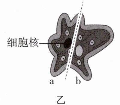 (3)科学家用玻璃针将一只变形虫切割为 a、b 两部分(如下图乙)开展探究实验。在适宜条件下培养,科学家发现 a 部分仍然有摄食行为并逐渐恢复成一只完整的变形虫,b 部分则失去摄食行为并逐渐死亡。该实验说明______。