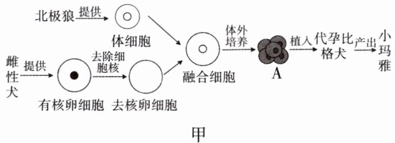 16. 我国科学家在北极狼的身上提取了皮肤样本,利用“某种技术”成功培育了一只“小玛雅”。下图甲是培育过程示意图,请据图回答问题。