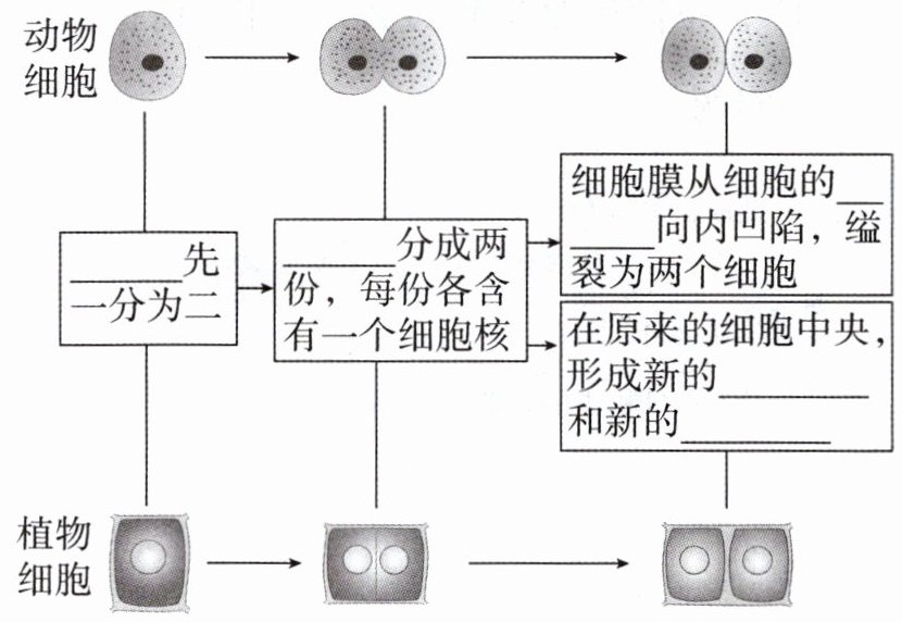 动物细胞:细胞核先一分为二,随后细胞质分成两份,最后细胞膜从细胞的中部向内凹陷,缢裂为两个;植物细胞:细胞核先一分为二,随后细胞质分成两份,最后在原来细胞的中央,形成新的细胞膜和新的细胞壁