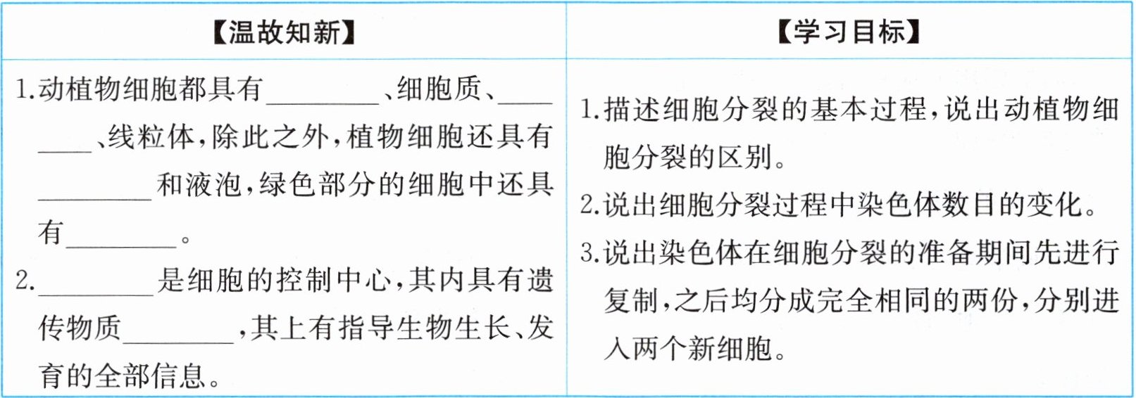 |1. 动植物细胞都具有____、细胞质、____、线粒体,除此之外,植物细胞还具有____和液泡,绿色部分的细胞中还具有____。|1. 描述细胞分裂的基本过程,说出动植物细胞分裂的区别。|