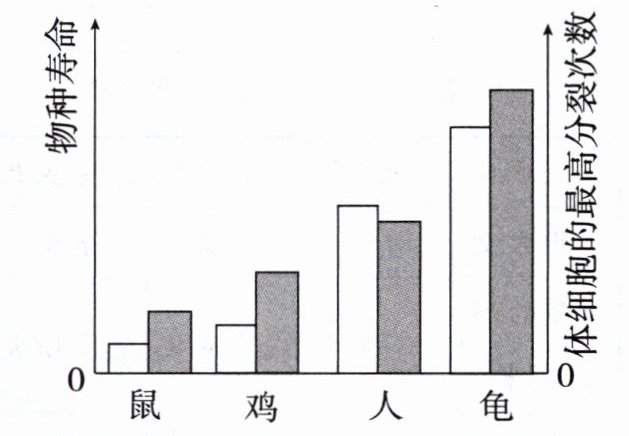 (2)实验二中,通过观察题图可知,细胞的最高分裂次数与物种寿命呈正相关。一般来说,寿命越长的物种,体细胞最高分裂次数的值越大。