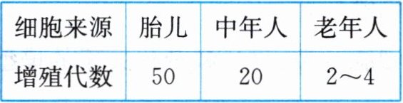 实验一 分别在相同的条件下,体外培养胎儿、中年人和老年人的肺的纤维细胞,结果如下表所示。