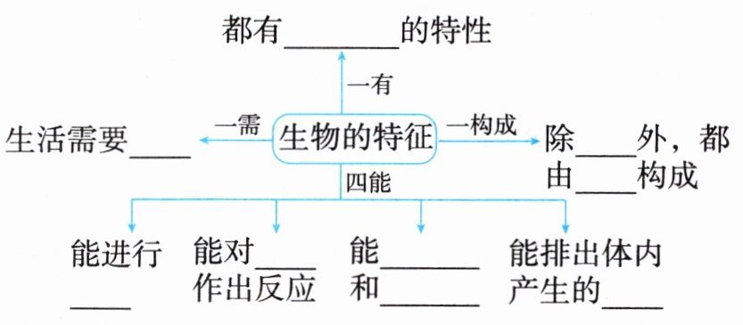 【温故知新】树木 昆虫 石头 汽车(答案不唯一,合理即可) 生物的特征 1.细胞 病毒 细胞 细胞 2.营养 光合作用 其他生物 3.呼吸 氧气 二氧化碳 4.外界刺激 5.生长 发育 繁殖 繁殖 6.遗传和变异 遗传 变异 7.体内产生的废物