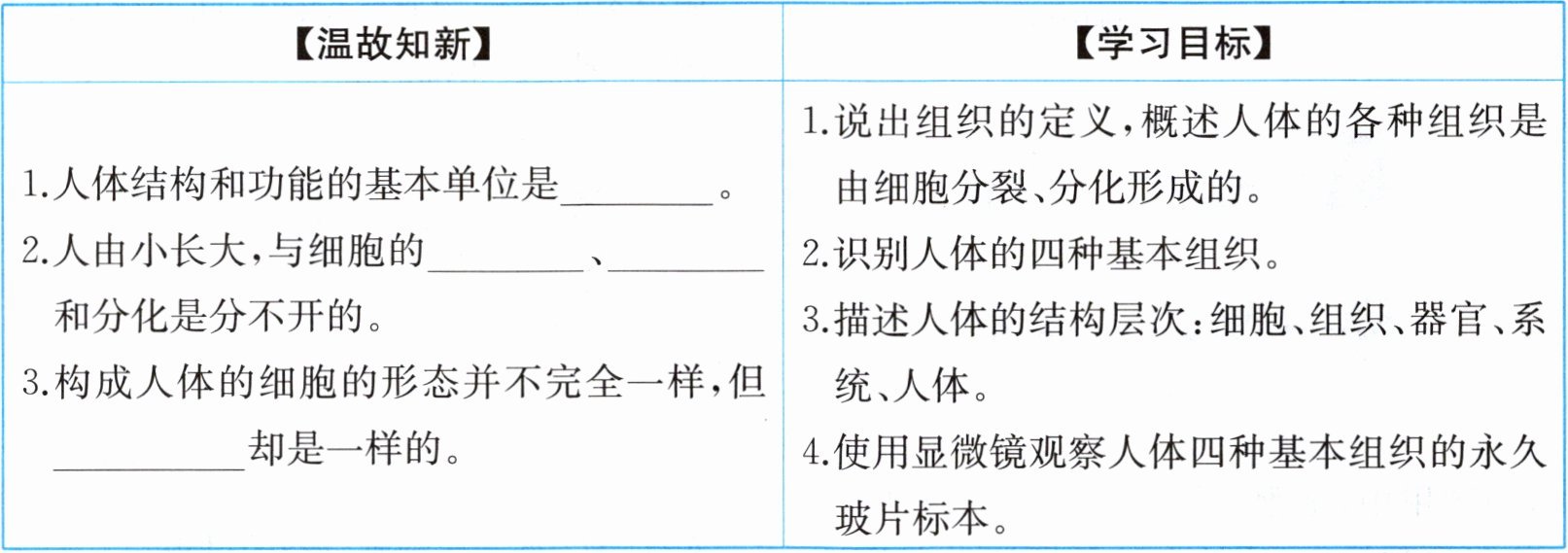 3. 构成人体的细胞的形态并不完全一样,但____却是一样的。|1. 说出组织的定义,概述人体的各种组织是由细胞分裂、分化形成的。