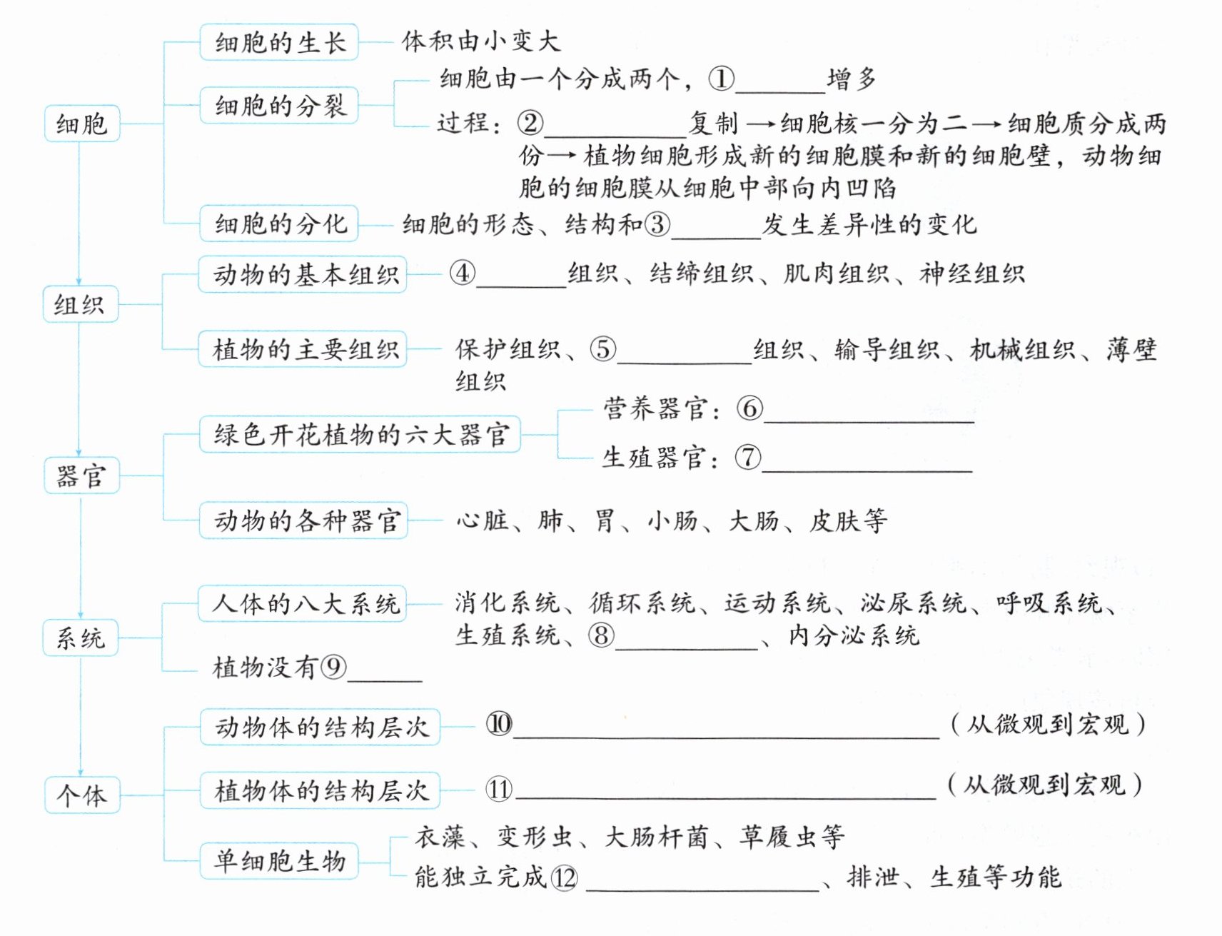 ①细胞数目 ②染色体 ③生理功能 ④上皮 ⑤分生 ⑥根、茎、叶 ⑦花、果实、种子 ⑧神经系统 ⑨系统 ⑩细胞→组织→器官→系统→动物体 ⑪细胞→组织→器官→植物体 ⑫摄食、消化、呼吸