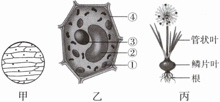 (2)与动物细胞不同的是,洋葱表皮细胞的最外层为______。切洋葱时,会有具刺激性气味的物质被释放出来,这些物质存在于图乙所示细胞的[ ]______中。用碘液染色后,染色最深的结构是图乙中的[ ]______,其内储存着______,对生物的生长、发育和遗传起着重要作用。
