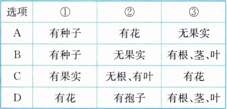 | D | 有花 | 有孢子 | 有根、茎、叶 |