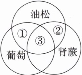 B 解析:油松属于裸子植物,葡萄属于被子植物,肾蕨属于蕨类植物,因此,①可以表示有种子,②可以表示无果实,③可以表示有根、茎、叶。
