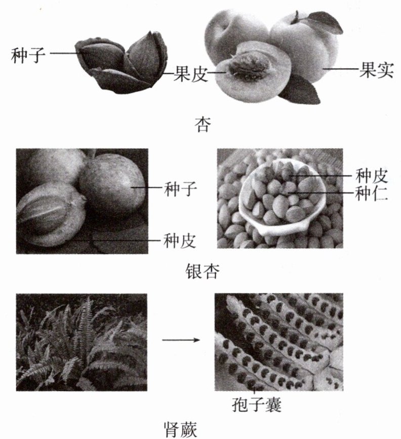 9. 某生物学兴趣小组的同学们在认真研究了银杏、肾蕨、杏的基础上,在老师的指导下,制作了杏、银杏、肾蕨的“果实”图。请分析回答下列问题。