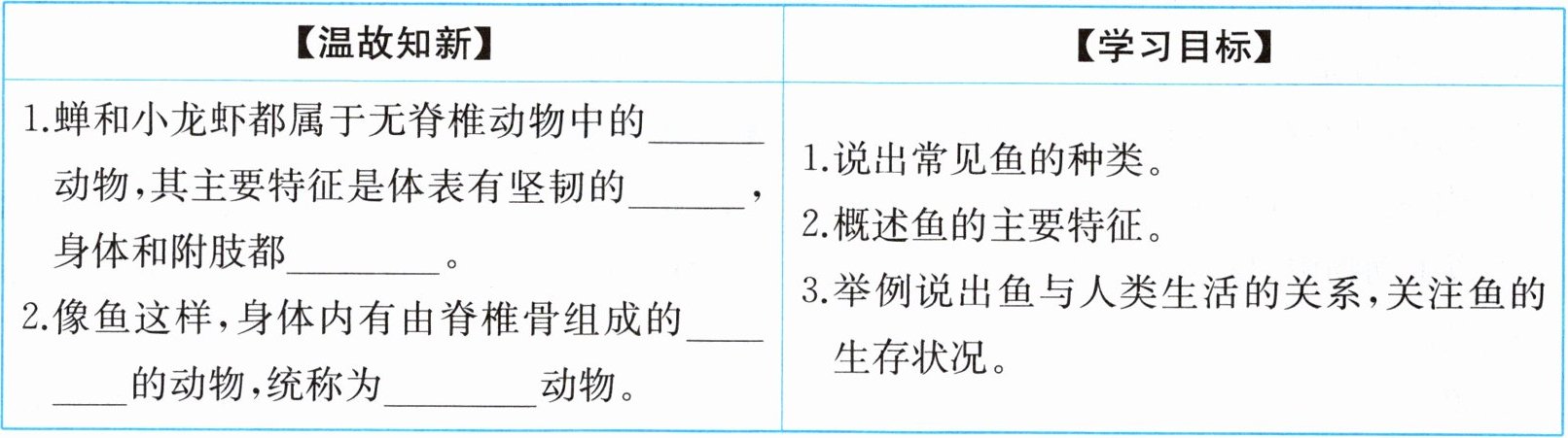 2. 像鱼这样,身体内有由脊椎骨组成的______的动物,统称为______动物。|1. 说出常见鱼的种类。