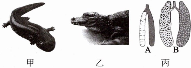 (2)图丙中的A和B分别为中国大鲵和扬子鳄肺的结构示意图,中国大鲵的肺结构简单,不能满足其对氧气的需求,还需要靠湿润的______辅助呼吸。