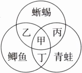 A 解析:青蛙、鲫鱼和蜥蜴的生殖方式都是卵生,因此甲可以代表卵生,A项正确;鲫鱼用鳃呼吸,因此乙不可以代表用肺呼吸,B项错误;蜥蜴的生殖和发育可以摆脱对水环境的依赖,因此丙不可以代表生殖和发育离不开水,C项错误;鲫鱼和青蛙的卵表面都没有坚韧的卵壳,因此丁不可以代表卵表面有坚韧的卵壳,D项错误。