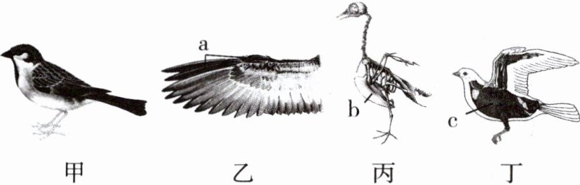③ 骨骼:图丙是鸟的骨骼示意图,鸟的骨骼轻、____,可以减轻体重。
