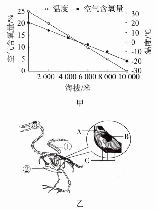 (1) 据图甲所示,斑头雁飞越喜马拉雅山脉需要克服的两个环境限制因素是____和____。斑头雁适应这样的飞行环境与其形态特点有关,表现在其体表有丰厚的____可以保温。