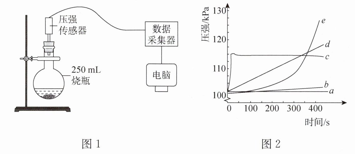 10. 运用手持技术探究金属与酸的反应。向250mL的烧瓶内注入25mL溶质质量分数为8.8%的稀盐酸,分别剪取长约4cm、宽约0.4cm的镁、铝、锌、铁、铜金属条,打磨后投入烧瓶中,迅速塞紧带有压强传感器的橡皮塞(如图1),点击采集,得到如图2所示的气压变化曲线。回答下列问题。