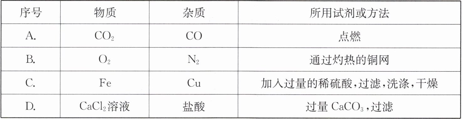 |D.|$CaCl_2$溶液|盐酸|过量$ CaCO_3,$过滤|