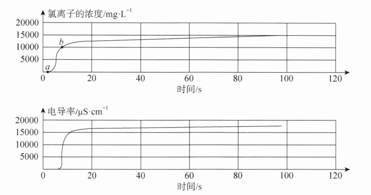 第三步:用氯离子传感器和电导率传感器同时采集数据,将一定质量的氯化钠迅速加入烧杯中,实验数据如下图所示。
