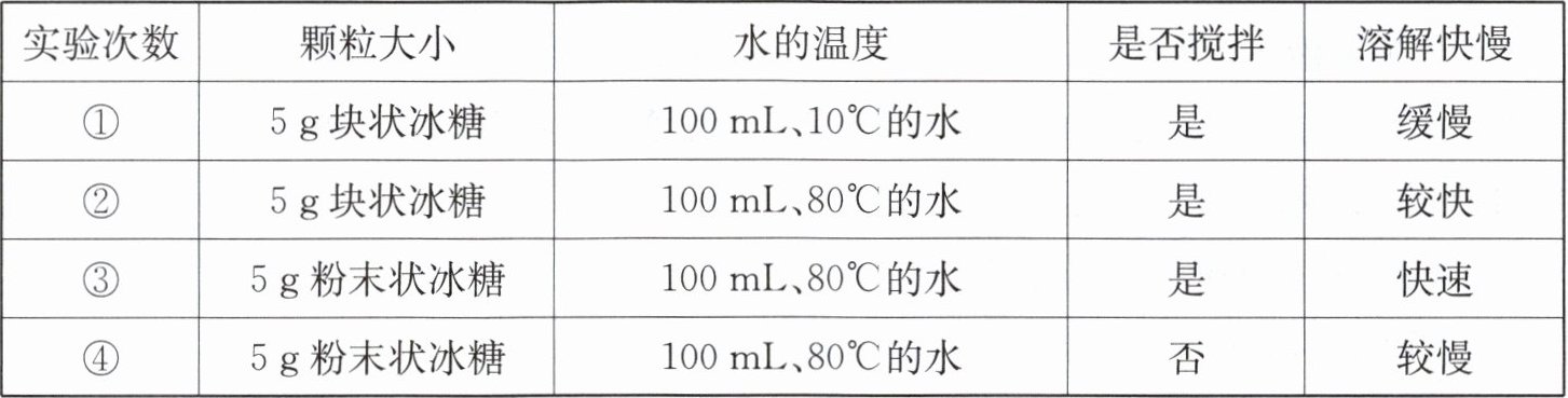 |①|5g块状冰糖|100mL、10℃的水|是|缓慢|