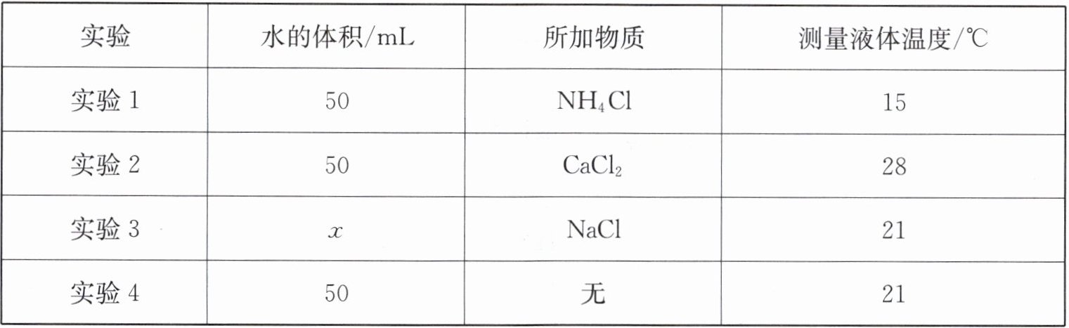 |实验|水的体积/mL|所加物质|测量液体温度/℃|