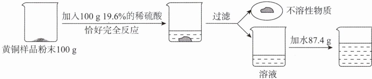 |$\begin{matrix}$黄铜样品粉末$100g\end{matrix} $|$\xrightarrow{加入100g\ 19.6\%的稀硫酸}$|$\begin{matrix}$恰好完全反应$\end{matrix} $|$\xrightarrow{过滤}$|$\begin{matrix}$不溶性物质$\\\end{matrix}\\ $|