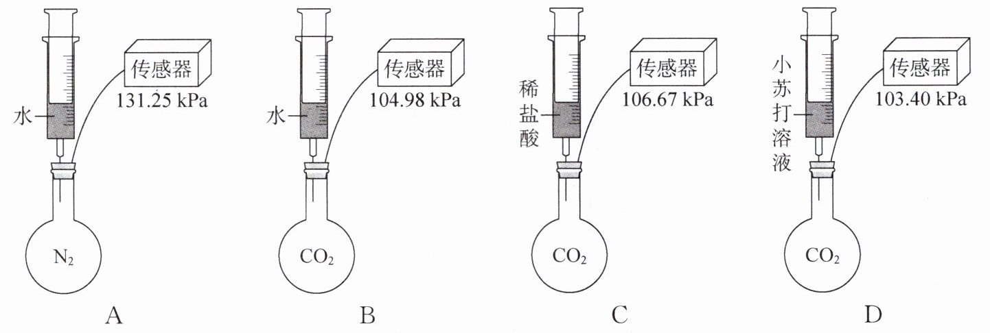 室温下,在烧瓶中收集250mL气体,分别加入50mL不同液体,用压强传感器测出充分振荡后烧瓶中气体的压强,实验结果如下页图所示。