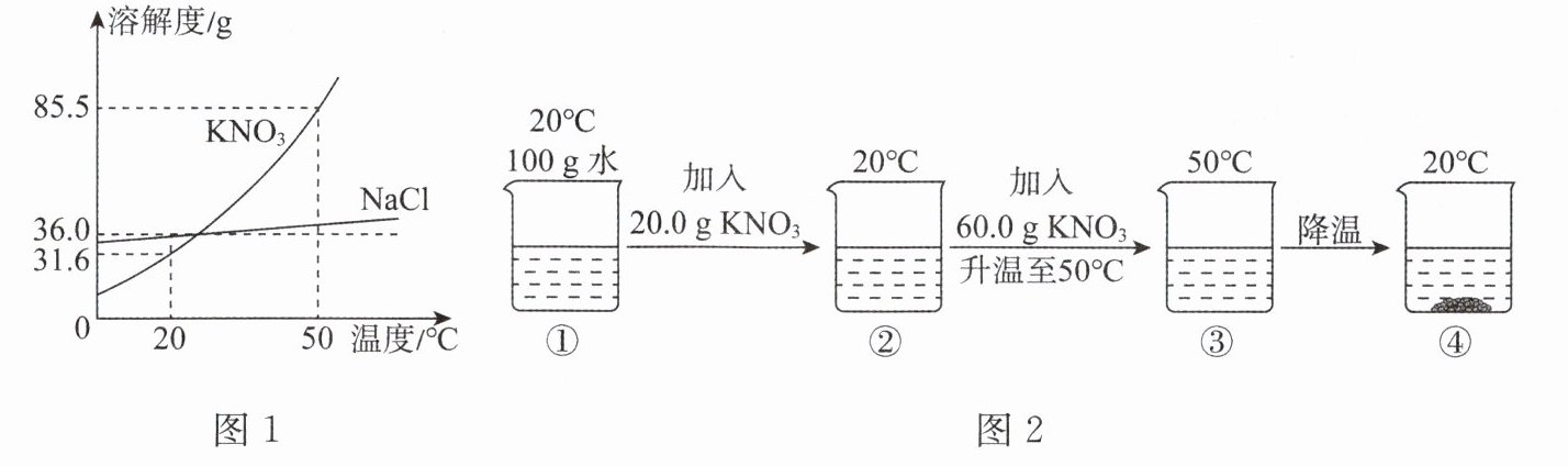 10. KNO_3和NaCl的溶解度曲线如下图1所示,某化学兴趣小组同学进行了如下图2所示实验(忽略水的损失)。根据图示回答下列问题。