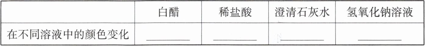 实验操作:将紫甘蓝在研钵中捣烂,加入 $1:1$ 的酒精溶液浸泡,过滤,得到滤液,即制得浸取液。然后将制得的浸取液依次滴加到分别盛有白醋、稀盐酸、澄清石灰水、氢氧化钠溶液的 $4$ 支试管中,观察并记录现象。
