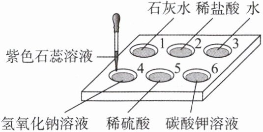 7. 如下图所示,在白色点滴板 $1\sim6$ 号孔穴中,分别滴加 $2$ 滴紫色石蕊溶液。