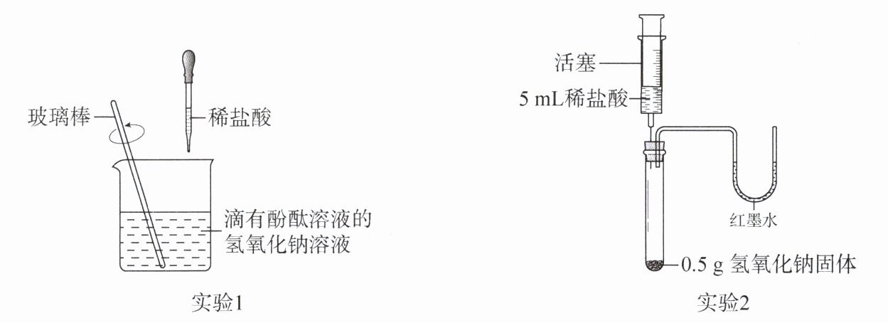 在实验1中,用滴管缓慢滴入稀盐酸,并不断搅拌。观察到烧杯内溶液由红色变为无色,该现象能证明氢氧化钠与盐酸反应,依据是______。用玻璃棒不断搅拌的作用是______。反应后溶液中一定含有的微观粒子是______(不考虑酚酞)。