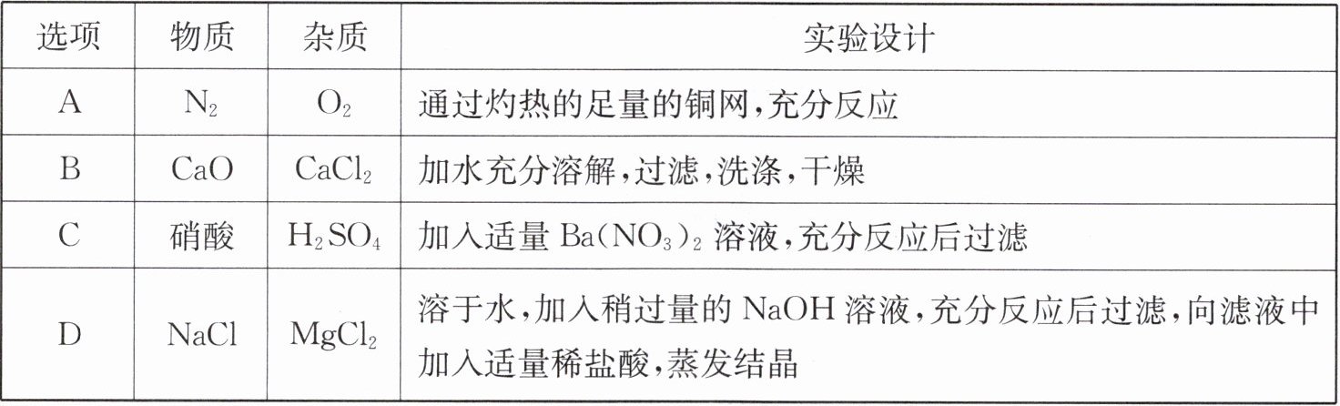| C | 硝酸 |$ H_2SO_4 $| 加入适量$ Ba(NO_3)_2$溶液,充分反应后过滤 |