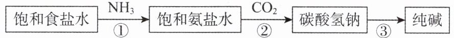 饱和食盐水$\xrightarrow[①]{NH_{3}}饱和氨盐水\xrightarrow[②]{CO_{2}}碳酸氢钠\xrightarrow[③]{}$纯碱