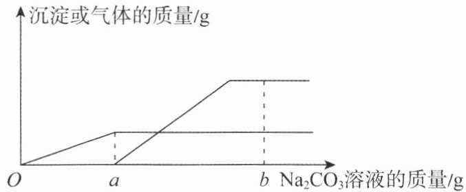 向滴有紫甘蓝指示剂的稀盐酸和$ CaCl_2$的混合溶液中,逐滴加入$ Na_2CO_3$溶液,反应所得沉淀或气体的质量变化如上图所示(图中一条曲线表示生成沉淀的质量变化情况,另一条曲线表示生成气体的质量变化情况)。
