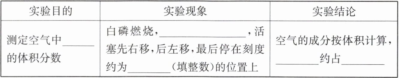 |测定空气中_________的体积分数|白磷燃烧,_________,活塞先右移,后左移,最后停在刻度约为_________(填整数)的位置上|空气的成分按体积计算,_________约占_________|