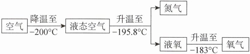 空气$\xrightarrow{降温至-200^{\circ}C}$液态空气$\xrightarrow{升温至-195.8^{\circ}C}\begin{cases}氮气\\液氧\xrightarrow{升温至-183^{\circ}C}氧气\end{cases}$