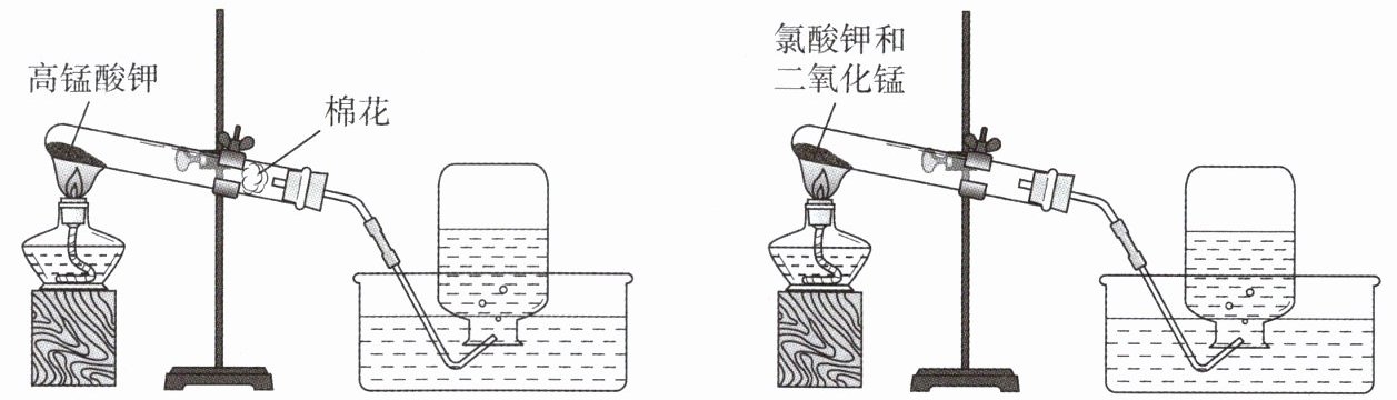 (2) 高锰酸钾$\overset{加热}{\rightarrow}$锰酸钾 + 二氧化锰 + 氧气;氯酸钾$\xrightarrow[加热]{二氧化锰}$氯化钾 + 氧气
